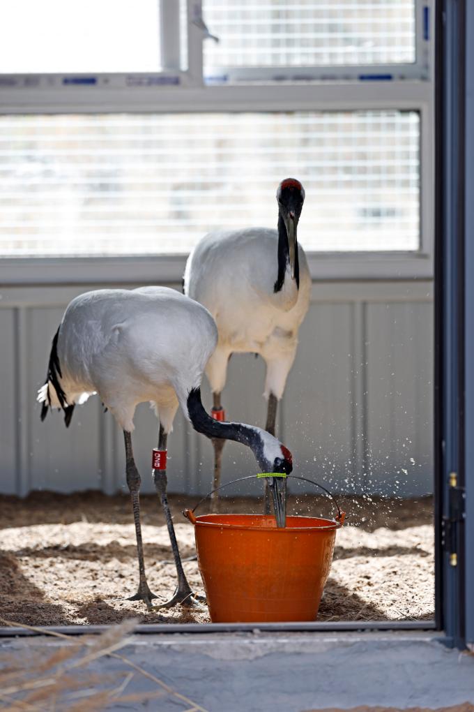 4月9日,在宁夏青铜峡库区湿地自然保护区丹顶鹤标准化适应性训练场,工作人员为丹顶鹤准备食物。