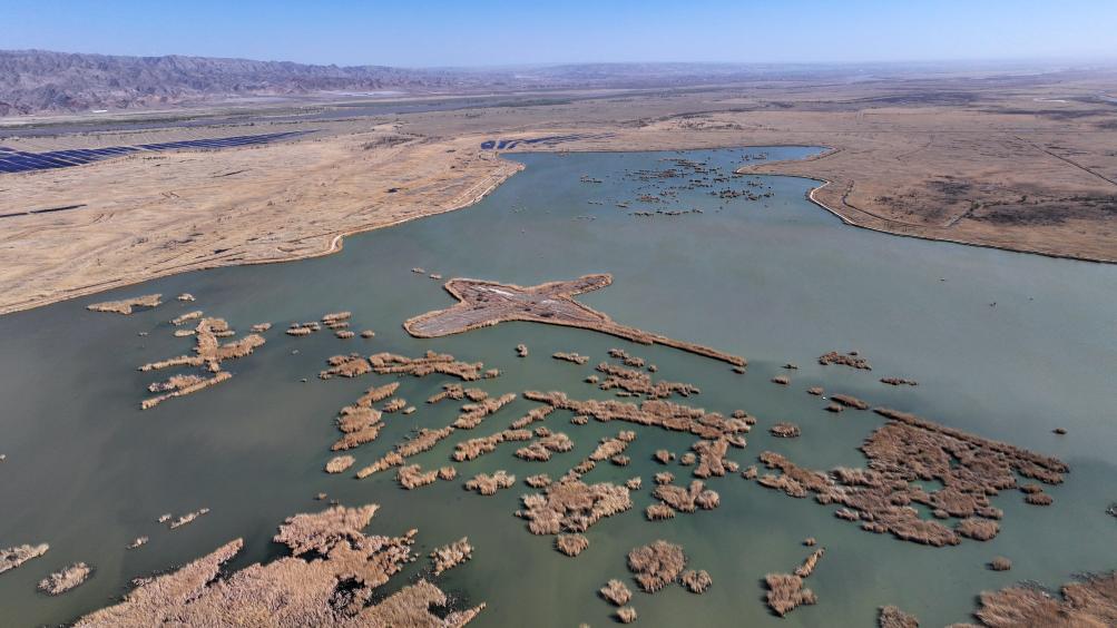 这是4月9日拍摄的宁夏青铜峡库区湿地自然保护区,丹顶鹤在适应性训练后将在这里野化放归(无人机照片)。