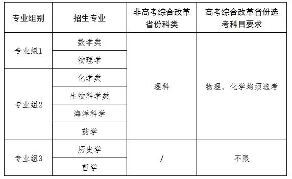 海洋科学专业:依托海洋与地球学院,围绕“海洋科学研究型教育和海洋拔尖创新型人才培养”之核心,实施海洋科学精英式教育,以多层次、多元化的培育模式,通过学科交叉、理论深入、实践教育、国际交流等方面的强化,夯实学生的人文素养、知识结构和思维能力,培养既有仰望星空之理想,又有脚踏实地之精神,具备扎实学科基础、优异科研潜力、超前创新意识、开阔国际视野的海洋拔尖人才。