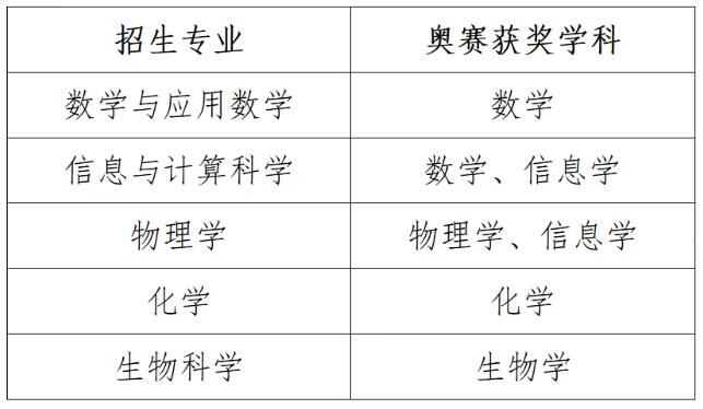 我校将对在数学、物理、化学、生物学、信息学奥林匹克竞赛中获得全国决赛二等奖及以上奖项的报名考生审核其相关学科领域的竞赛成绩,审核通过后可以破格入围。审核通过的破格入围考生高考成绩须达到所在省(自治区、直辖市)同科类部分特殊类型相应最低录取控制分数线。