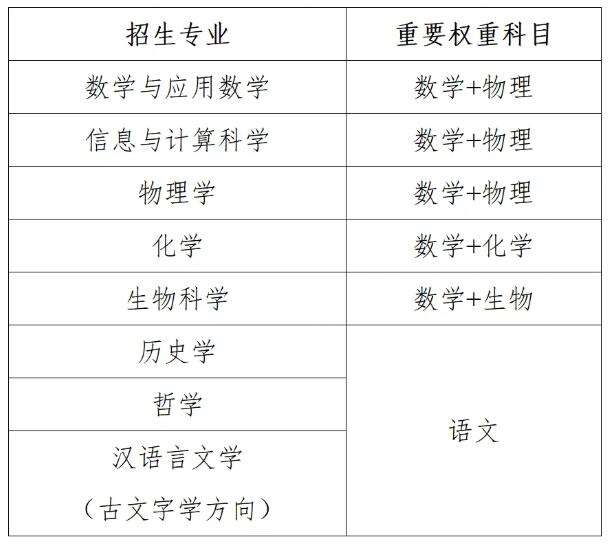 入围成绩=重要权重科目高考成绩*1.5+其他科目高考成绩之和