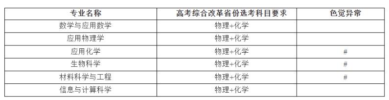 2.对考生身体健康状况的要求执行教育部、原卫生部、中国残疾人联合会制定并下发的《普通高等学校招生体检工作指导意见》中的规定。标记“#”的专业不招收相关色觉异常(色盲、色弱、单色不能识别)考生。