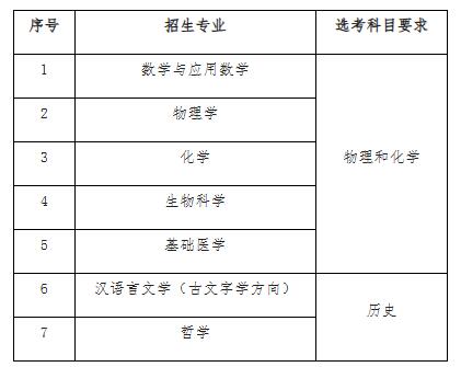 为突出基础学科在国家关键领域的支撑引领作用,同时聚焦国家人才紧缺的人文社会科学领域,我校强基计划招生专业设置如下:数学与应用数学、物理学、化学、生物科学、基础医学、汉语言文学(古文字学方向)﹑哲学,具体分省分专业招生计划以报名系统内公布为准。