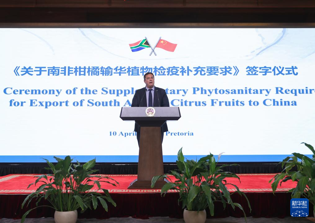 4月10日,在南非比勒陀利亚,南非农业部长斯廷黑森在《关于南非柑橘输华植物检疫补充要求》签字仪式上致辞。新华社记者 陈为 摄