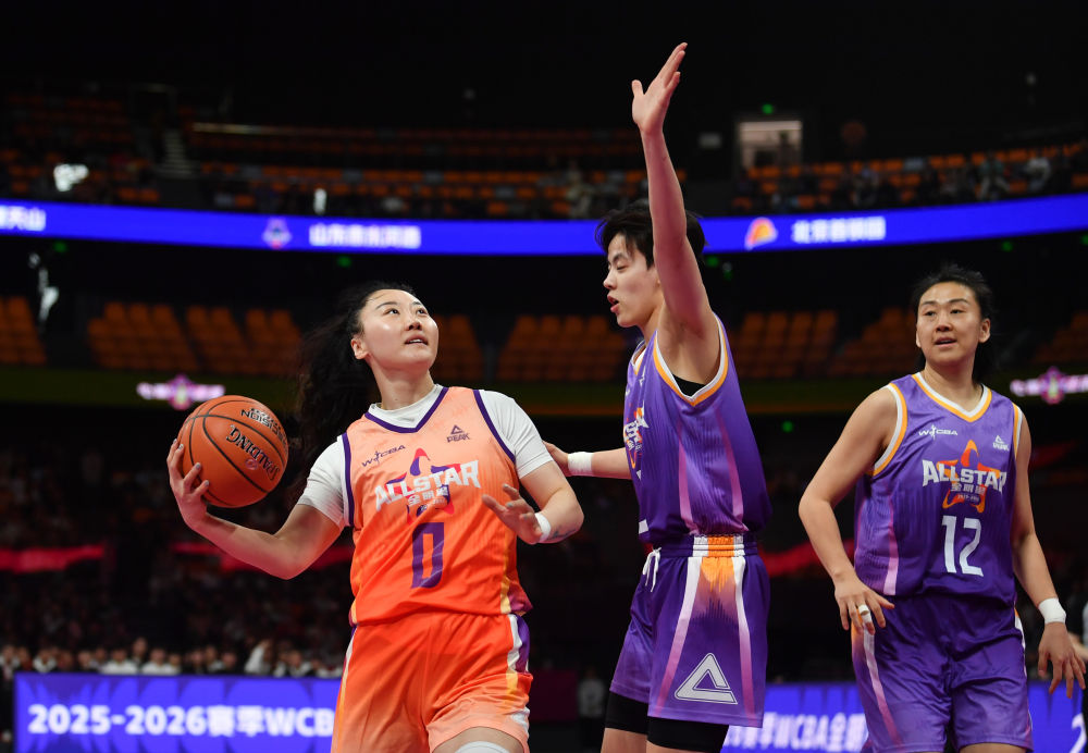 3月22日,在陕西西安举行的2025-2026赛季WCBA全明星赛中,北区明星队球员武桐桐(左一)在比赛中上篮。新华社记者 张博文 摄