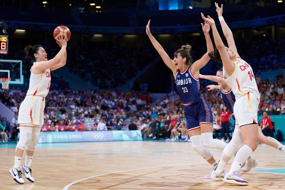 2024年7月31日,武桐桐(左)在巴黎奥运会女子篮球小组赛中。新华社记者 孟鼎博 摄