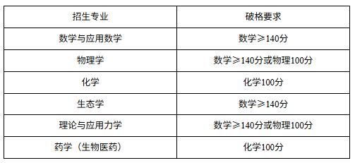 报考数学与应用数学、物理学、化学、生态学、理论与应用力学、药学(生物医药)专业且已确认报考的学生,如单科成绩符合以下要求,可破格入围我校考核: