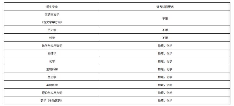 (一)强基计划招生专业包括汉语言文学(古文字学方向)、历史学、哲学、数学与应用数学、物理学、化学、生物科学、生态学、基础医学、理论与应用力学、药学(生物医药)。各专业选考科目要求如下:
