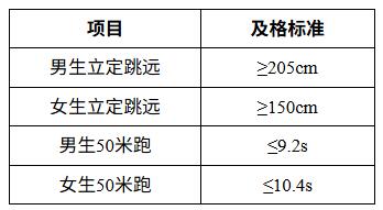 2.考生需参加由我校组织的体育测试,测试项目可自主选择立定跳远或50米跑。体育测试不受理缓考、补考申请。体育测试及格标准如下: