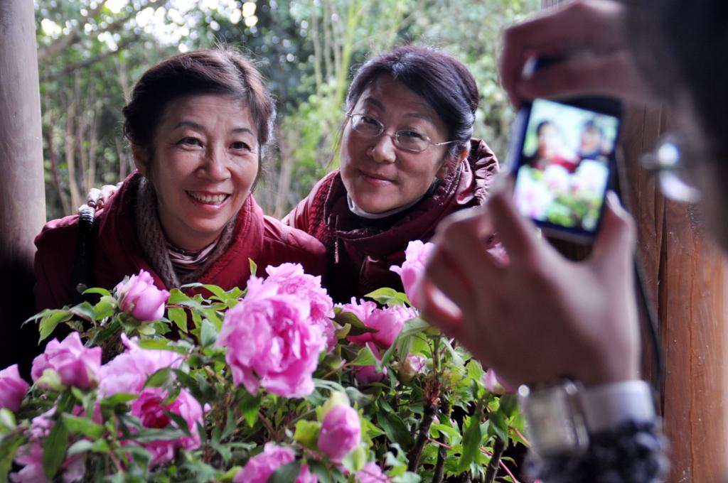 在南宁市青秀山民族风情长廊,两名游客与牡丹花合影(2012年1月24日摄)。