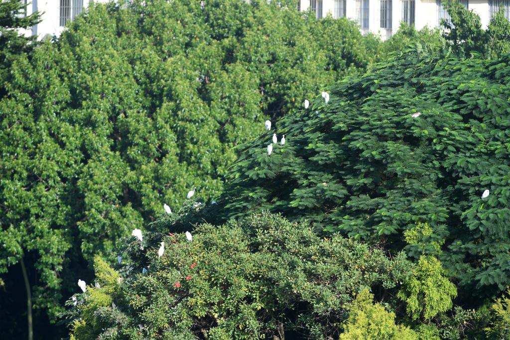 鸟儿在南宁市南湖畔的树上休憩(2021年10月12日摄)。