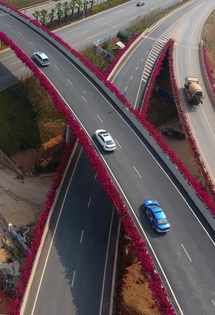 车辆从开满鲜花的南宁市竹溪立交桥经过(2019年8月31日摄)。
