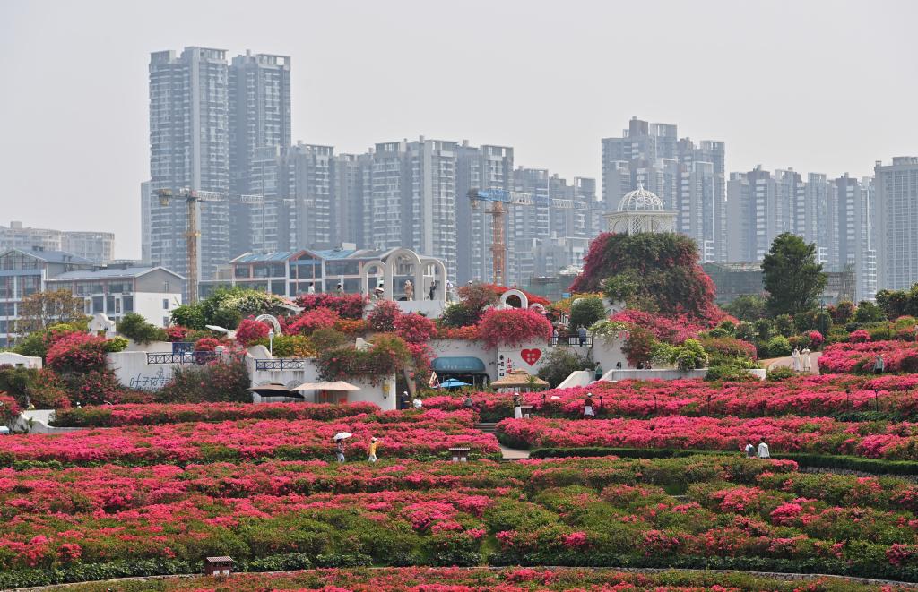 人们在南宁市青秀山欣赏盛开的鲜花(2026年4月12日摄)。由于地处祖国南疆