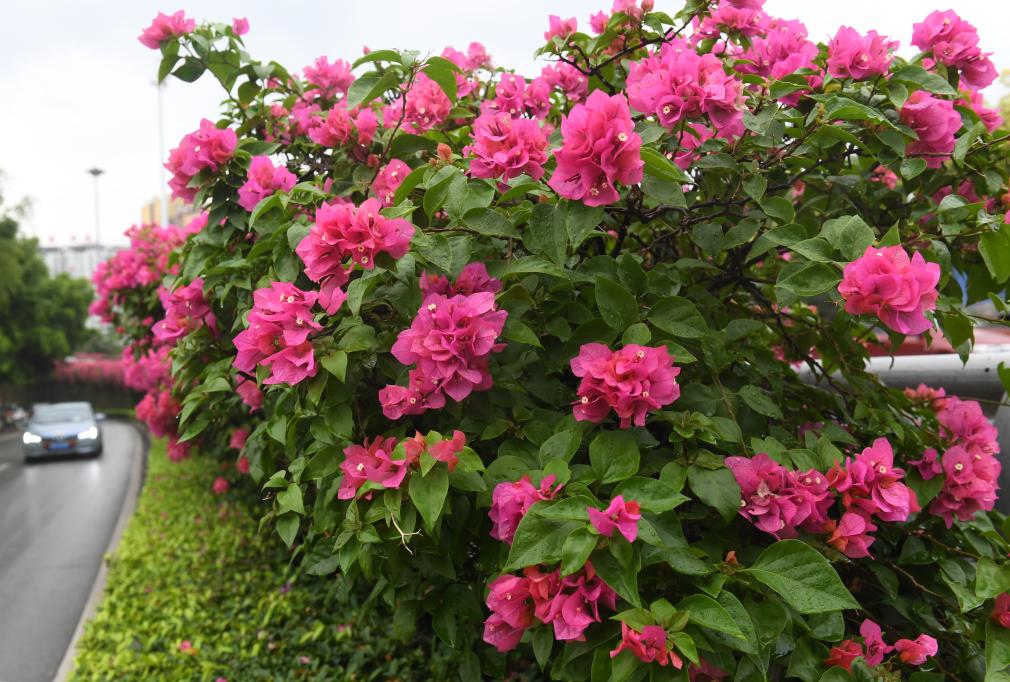 市民在南宁市青环路欣赏盛开的三角梅(2019年3月30日摄)。