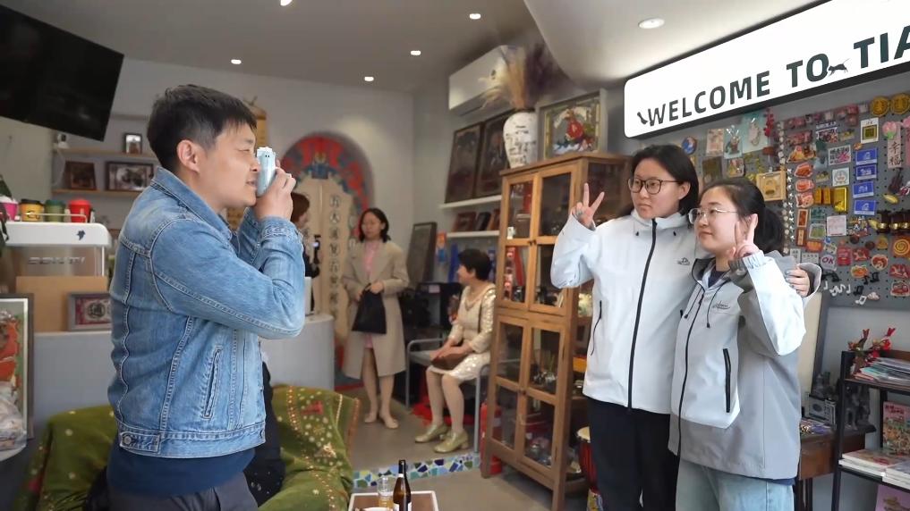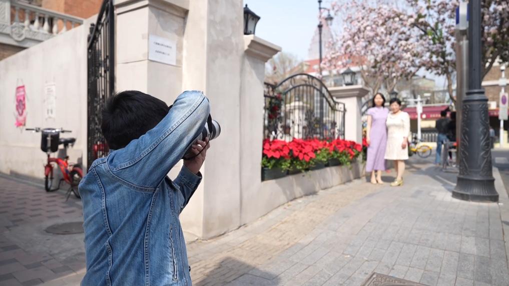 天津市和平区五大道,海棠花迎春绽放,游人如织,快门闪动。随着游客拍照打卡需求激增,复古照相馆主理人欣鹏忙碌不停。见到欣鹏时,他正在为一对母女拍照。张女士和母亲来自东北,现在生活在天津,来拍照是一早就规划好的。