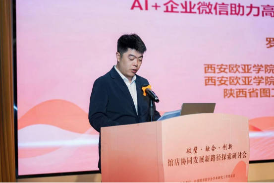 罗征以“AI+企业微信助力高校图书馆管理与服务创新”为题作报告。他介绍,欧亚图文信息中心以优质电子资源赋能教学科研与人才培养,通过“总馆+分馆”体系打造5分钟阅读圈,将阅读活动转化为创意实践,全面培育师生终身学习能力。他指出,AI已成为图书馆数智化转型的核心驱动力,并分享欧亚图书馆智能赋能服务与管理的创新探索。未来将持续紧跟技术前沿,以数智融合重构服务模式、提升运营效能,为高校图书馆高质量发展提供可借鉴的创新范式。