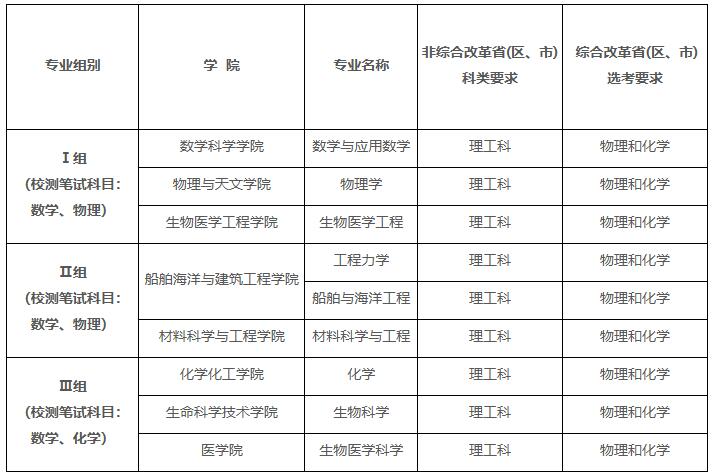 所有按要求完成报名的第一类考生可参加我校组织的笔试(高考后一周内),具体时间安排详见准考证。报考Ⅰ或Ⅱ组的笔试科目为“数学、物理”,报考Ⅲ组的笔试科目为“数学、化学”。我校将根据笔试成绩,按照不超过各省(区、市)各专业组别招生计划4倍的比例,分别确定各省(区、市)各专业组别笔试通过的考生名单,末位同分考生均予以入围。未通过笔试的考生不参与后续环节及录取成绩排序。