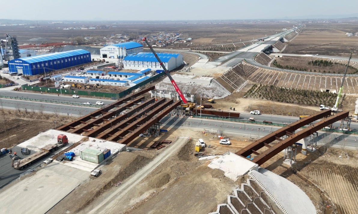 作为项目关键控制性工程之一,伊通北互通施工现场同样繁忙。沥青拌和站机声隆隆,为路面施工源源不断供应混合料;墩柱间,大型吊车正精准吊装钢箱梁;不远处,收费站房建工程同步推进,主体结构日渐成形……