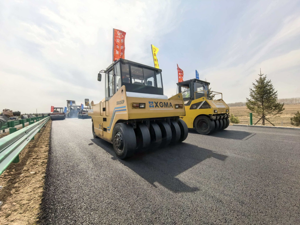 在该项目04工区K99+000路面施工现场,春日的阳光洒在宽阔的路基上,空气中弥漫着沥青蒸腾的热气与生机勃发的干劲。巨大的沥青摊铺机缓缓前行,将滚烫的混合料均匀铺开;紧随其后的数台压路机来回有序碾压,发出沉稳有力的轰鸣。随着机械阵列稳步推进,一条乌黑发亮、平整如镜的高标准路面不断向前延伸。