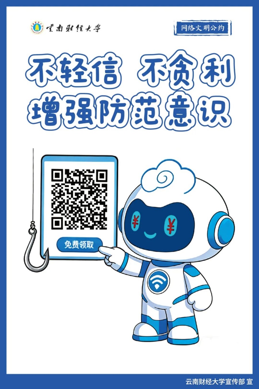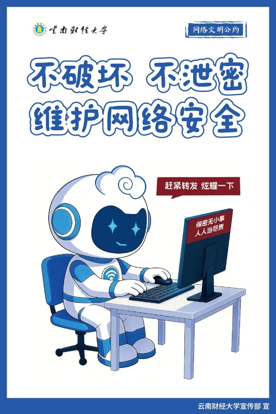 为增强全体师生员工的网络责任意识和自我保护意识,共同营造清朗的网络空间,云南财经大学于2024年发布《云南财经大学网络文明公约》,近期更推出《云南财经大学网络文明公约》(海报版),希望每一位师生用指尖的温度,践行文明、守护清朗,共同书写网络文明的答卷。