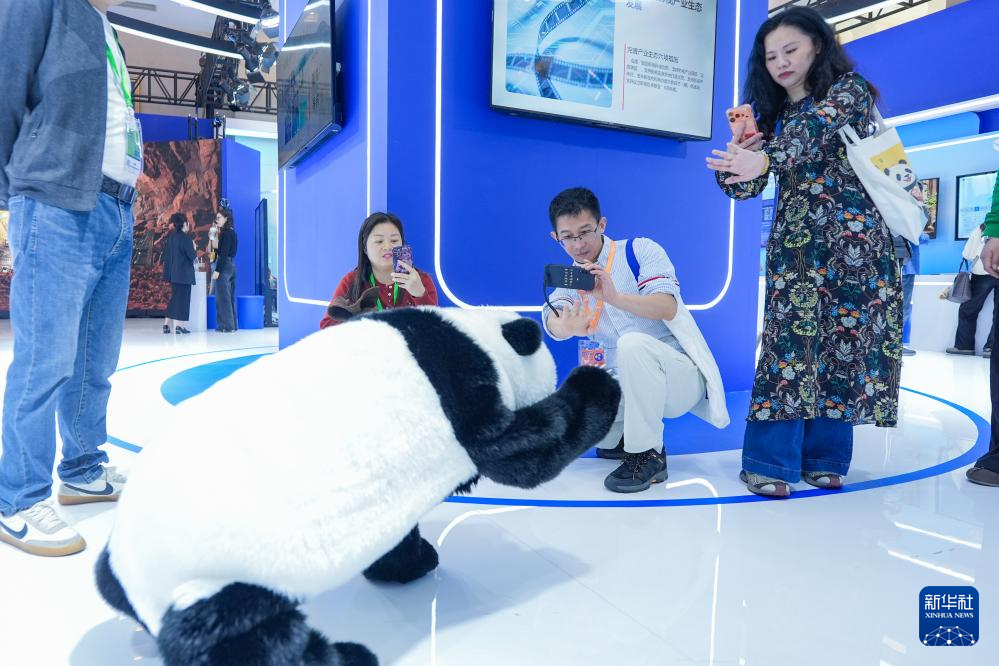 4月15日,参会者在创新展交区和仿真机器熊猫互动。