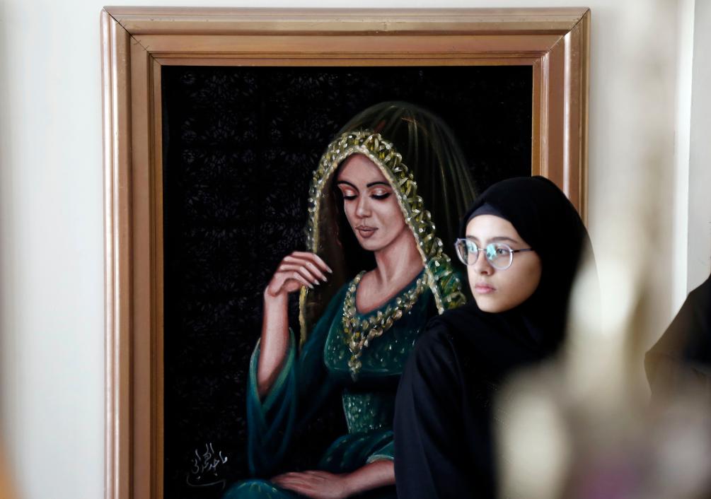 4月14日,在也门首都萨那,一名女孩参观艺术展上的画作。