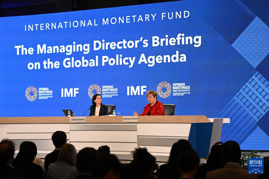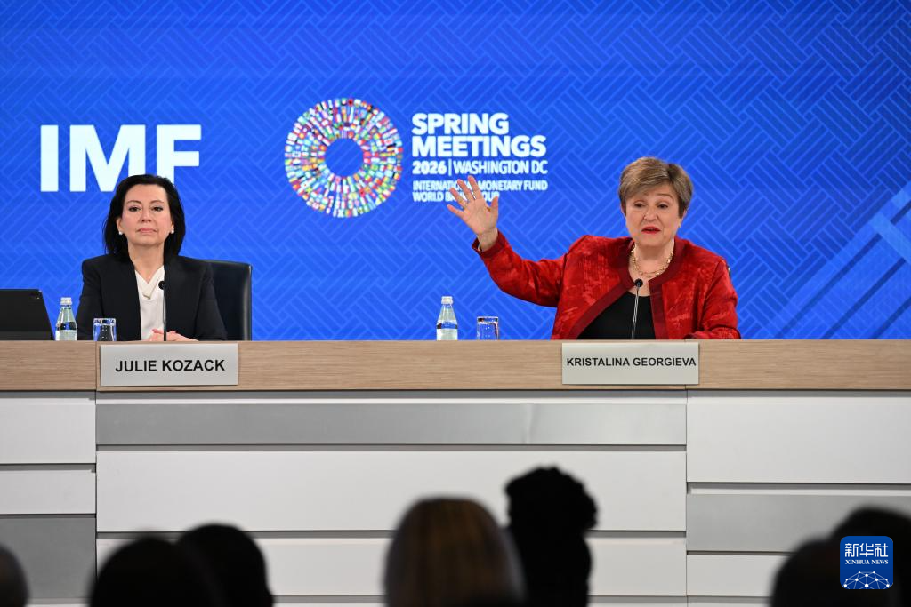 4月15日,在美国首都华盛顿,国际货币基金组织(IMF)总裁格奥尔基耶娃(上右)在IMF和世界银行春季会议期间的新闻发布会上讲话。新华社记者 李睿 摄