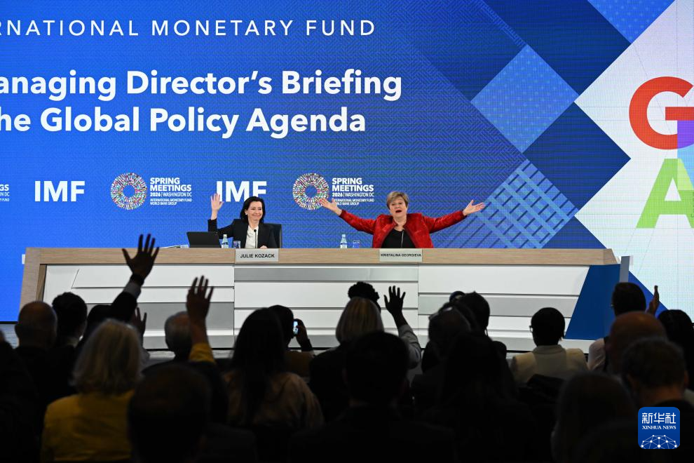 4月15日,在美国首都华盛顿,国际货币基金组织(IMF)总裁格奥尔基耶娃(上右)在IMF和世界银行春季会议期间的新闻发布会上等待记者提问。新华社记者 李睿 摄