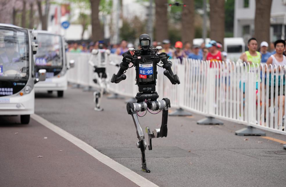 4月19日,北Y赛队自主人形机器人选手宇树H1(前)在比赛中。新华社记者 雒圆 摄