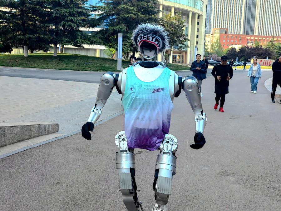 山东优宝特智能机器人有限公司研制的人形机器人“行者泰山”进行马拉松训练。新华社发