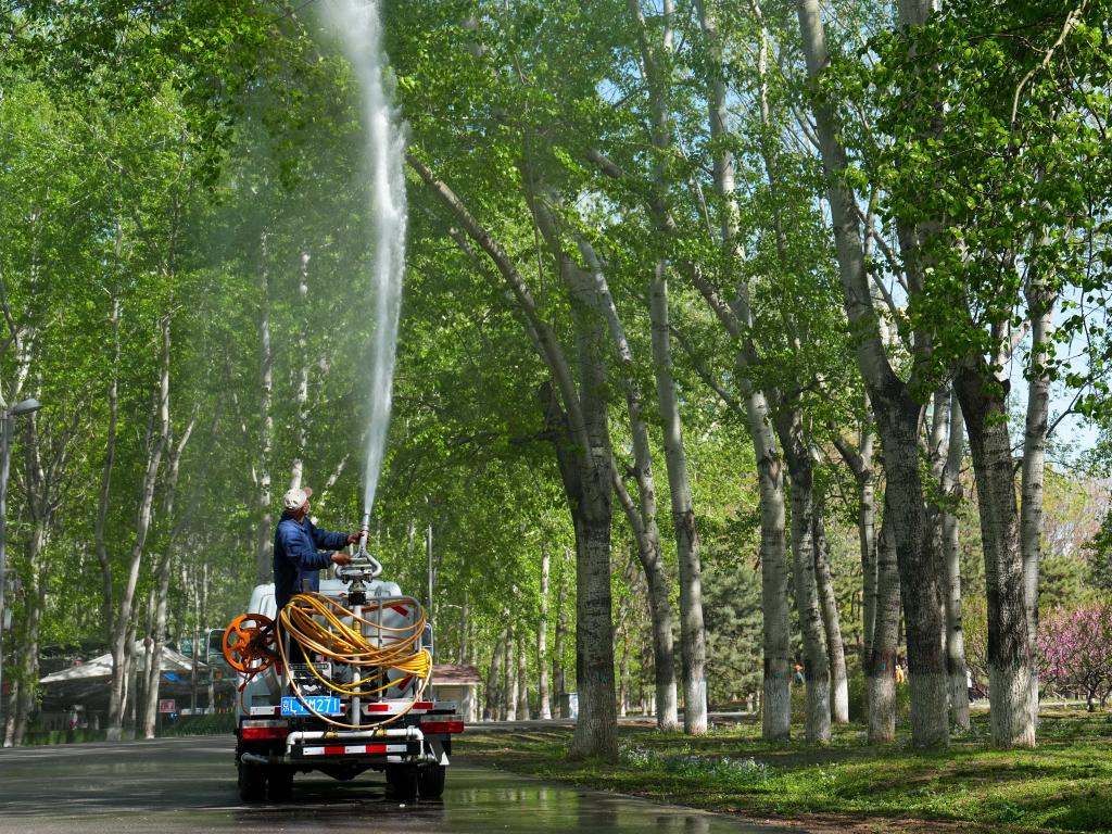 在北京奥林匹克森林公园,工作人员在用加入了凝絮剂的水喷洒杨树。新华社记者 鞠焕宗 摄
