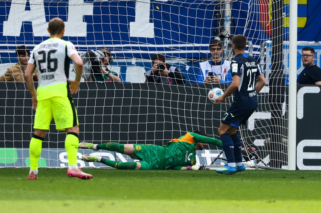 霍芬海姆此役开局积极,很快占据场上主动。面对主队严密的防线,多特蒙德在进攻端办法不多。上半场结束前,场上局势出现转折。聚勒在一次防守中滑倒后手球,主裁判在视频助理裁判(VAR)提醒后判罚点球,克拉马里奇在第42分钟主罚命中,帮助霍芬海姆取得领先。聚勒随后因伤无法坚持,被本塞拜尼换下。