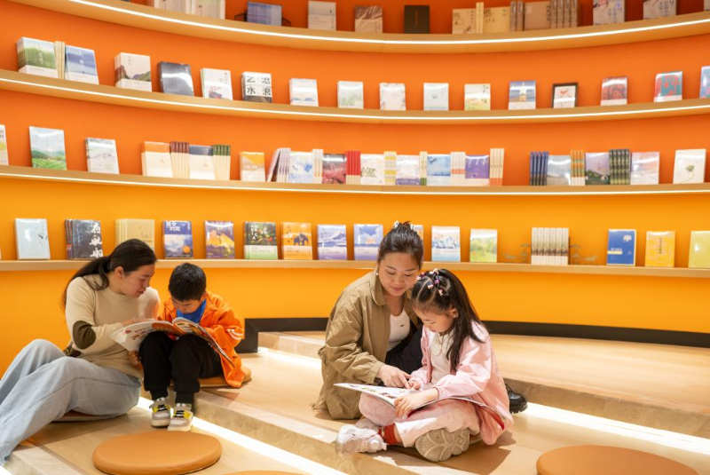 4月19日,在湖北省秭归县一家书店,家长陪同孩子阅读书籍。