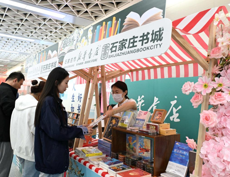 4月19日,市民在河北省石家庄市图书馆全民阅读主题活动现场挑选书籍。