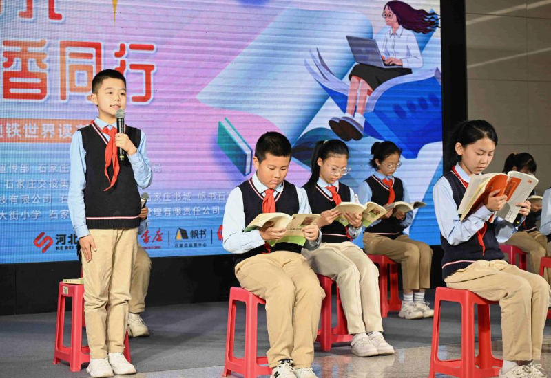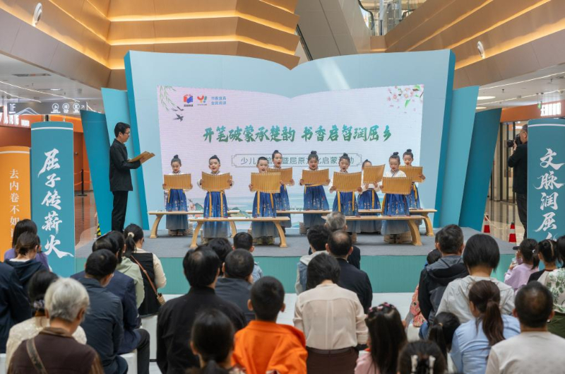 4月19日,孩子们在湖北省秭归县天问书城室内广场集体朗诵。