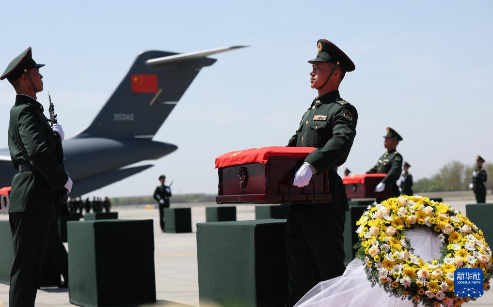 4月22日,第十三批在韩中国人民志愿军烈士遗骸由中国空军运-20B从韩国接回辽宁沈阳。这是迎回仪式上,礼兵手捧覆盖着五星红旗的志愿军烈士遗骸棺椁。4月22日上午,第十三批在韩中国人民志愿军烈士遗骸由中国空军运-20B从韩国接回辽宁沈阳。12位志愿军烈士英灵及146件遗物回到祖国怀抱。新华社发(余红春 摄)
