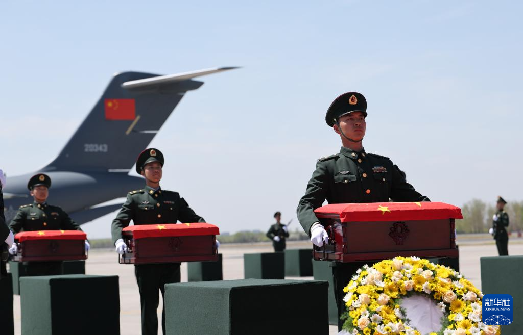 4月22日,第十三批在韩中国人民志愿军烈士遗骸由中国空军运-20B从韩国接回辽宁沈阳。这是迎回仪式上,礼兵双手捧起覆盖着五星红旗的志愿军烈士遗骸棺椁,缓步走下专机。4月22日上午,第十三批在韩中国人民志愿军烈士遗骸由中国空军运-20B从韩国接回辽宁沈阳。12位志愿军烈士英灵及146件遗物回到祖国怀抱。新华社发(余红春 摄)