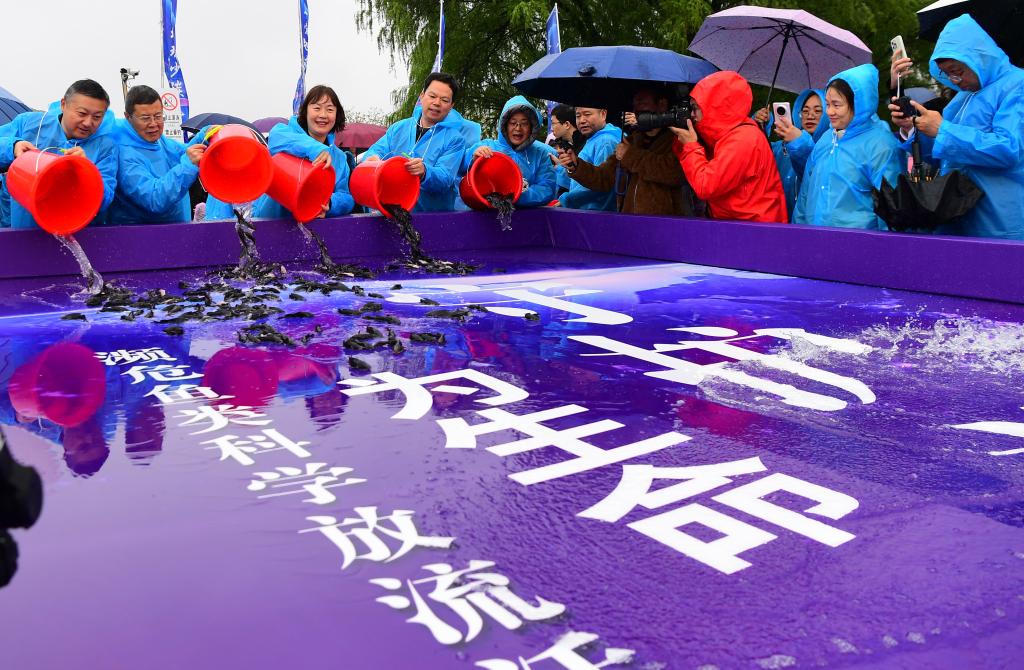 4月22日,在长江江苏江阴段,人们参与放流活动。