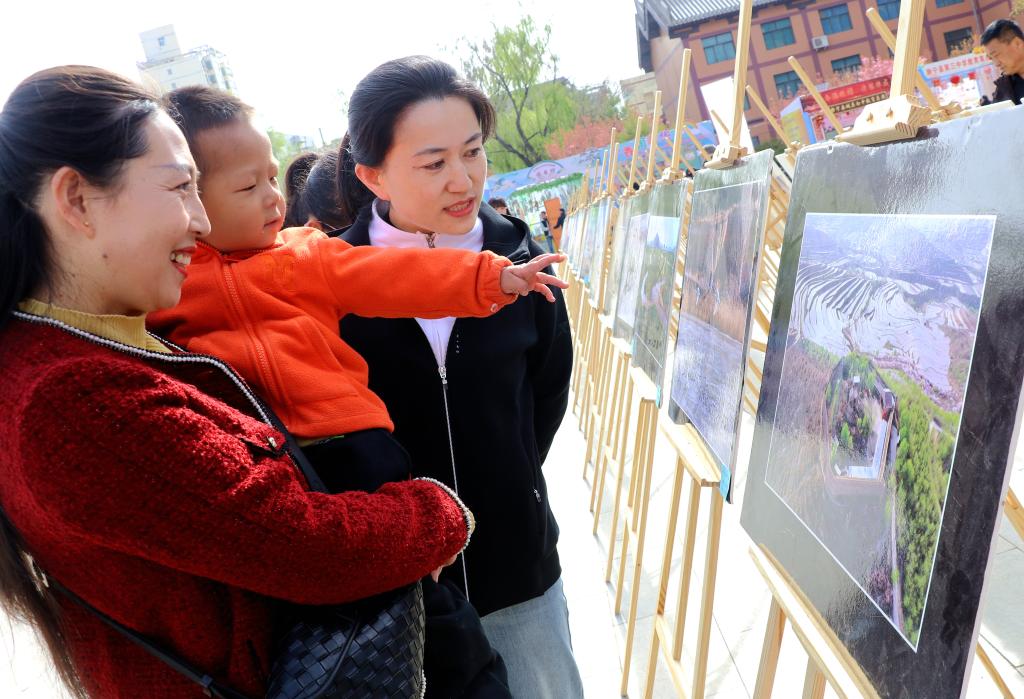 4月22日,在甘肃省平凉市静宁县成纪文化城广场,群众在欣赏“静宁风情”摄影展。