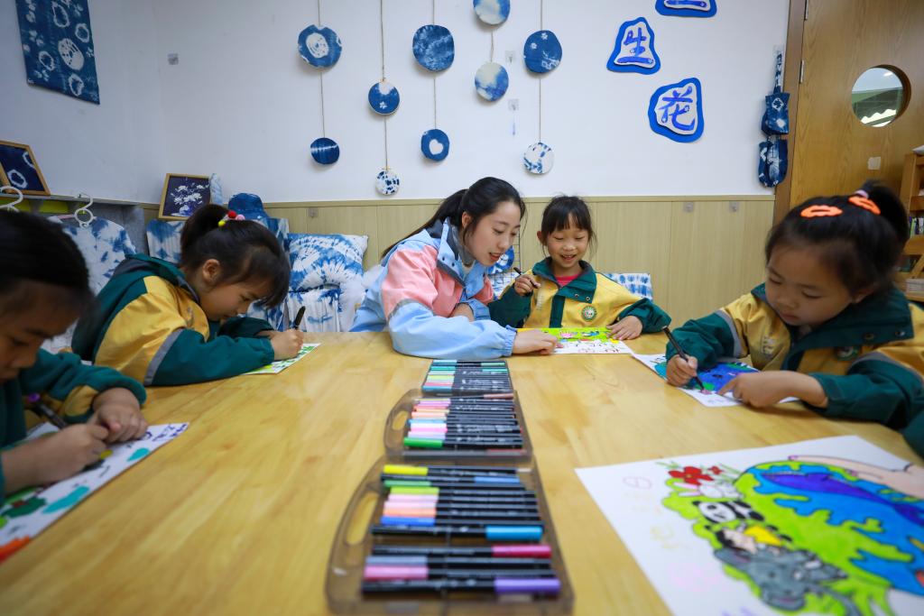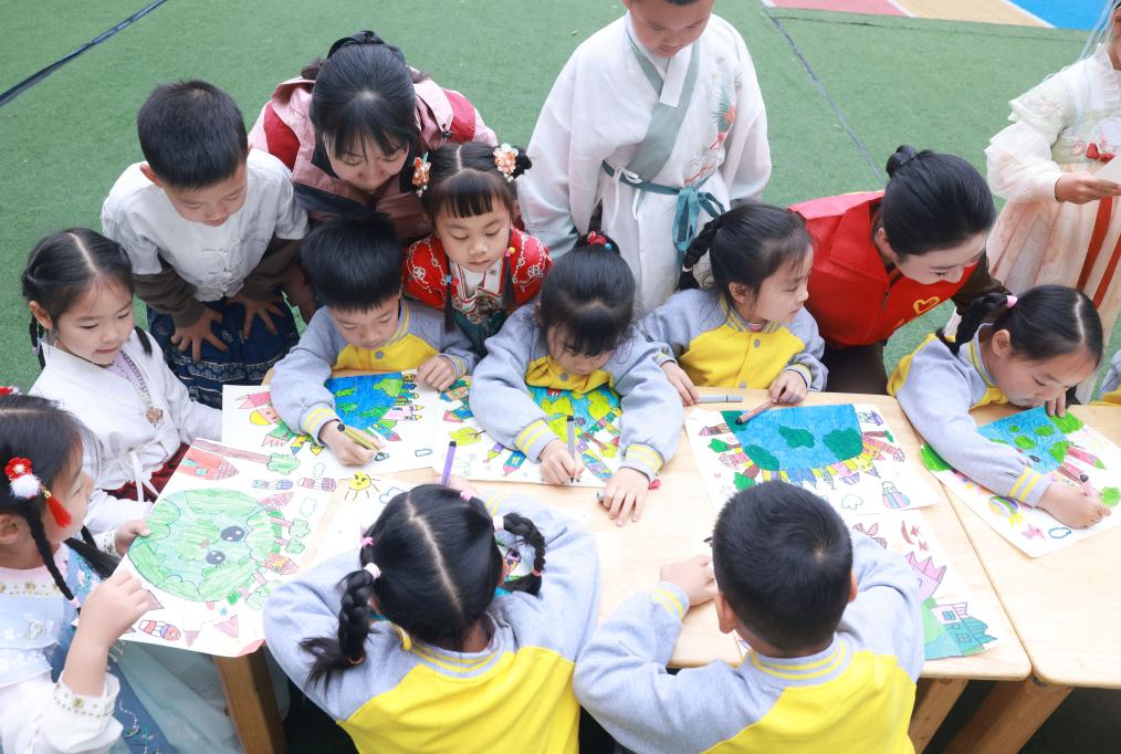 4月22日,在湖北省武汉市江岸区百步亭快乐天使幼儿园,孩子们以画笔绘山河。