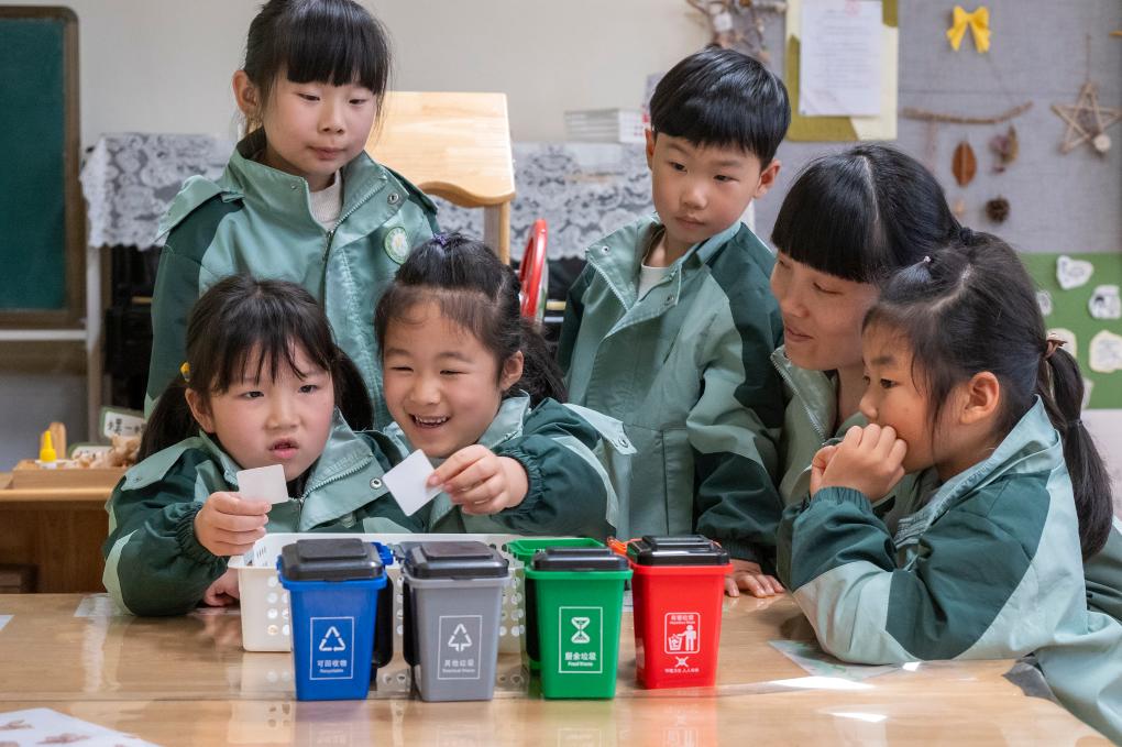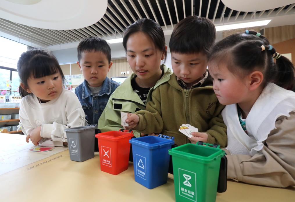 4月21日,在安徽省芜湖市繁昌区春谷幼儿园,小朋友学习垃圾分类知识。