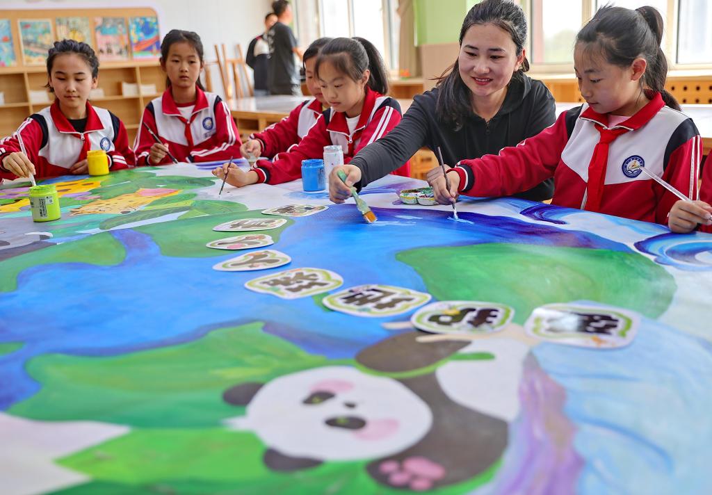 4月21日,河北省秦皇岛市海港区新一路小学集团产业新城第一小学教师带领学生绘制环保主题长卷。