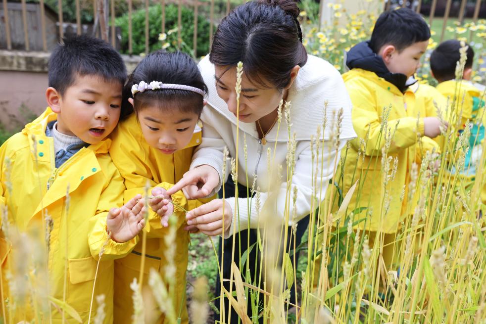 4月21日,在浙江省湖州市德清县乾元镇第一幼儿园农场,老师给小朋友介绍小麦生长情况。