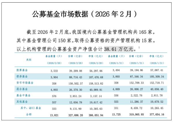 从公募基金看,中国证券投资基金业协会数据显示,截至2026年2月末,公募基金资产净值合计38.61万亿元,自2025年4月起连续11个月刷新历史新高。