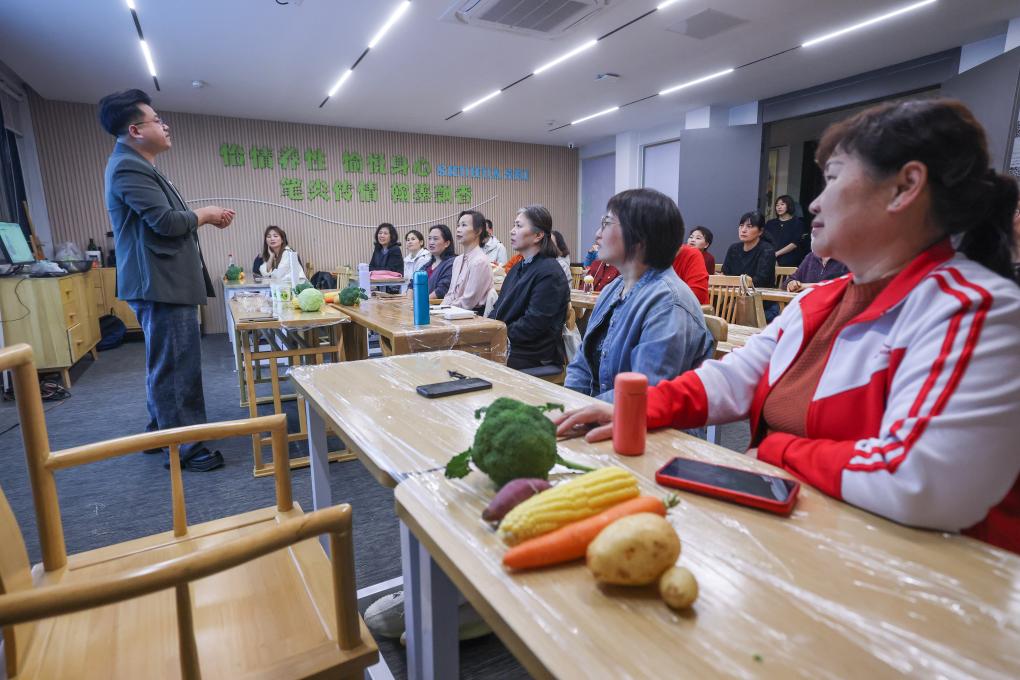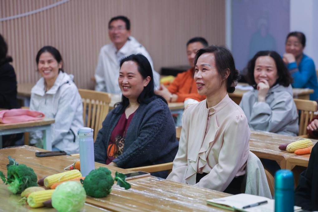 4月20日,在杭州市临平区东湖街道老年学校教室里,社区老年人在上科学膳食营养课程。