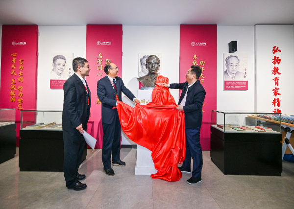 随后,阎达五塑像揭幕仪式在通州校区商学楼举行。朱信凯、支晓强、周明德共同为塑像揭幕。