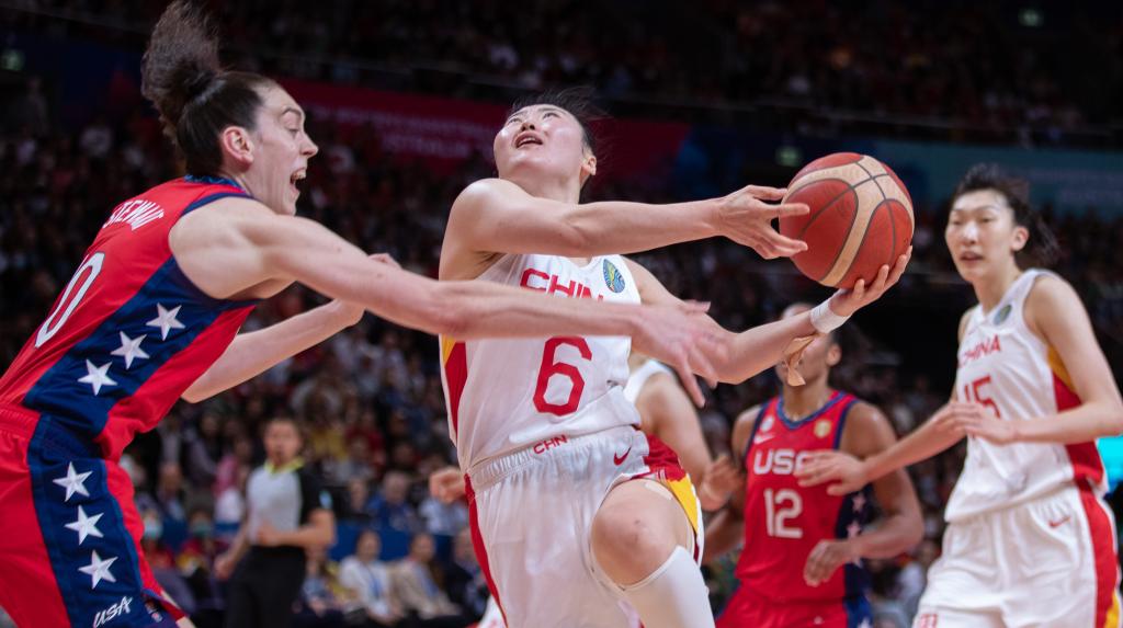 中国队球员武桐桐(左二)在2022年女篮世界杯决赛中突破。新华社发(胡泾辰摄)