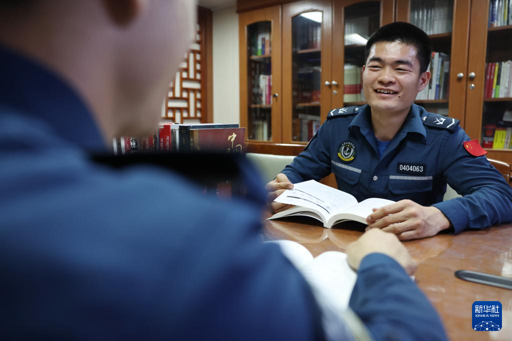 4月17日,海警川山舰执法员刘坤鹏(右)在船舱内的阅览室与战友交流。