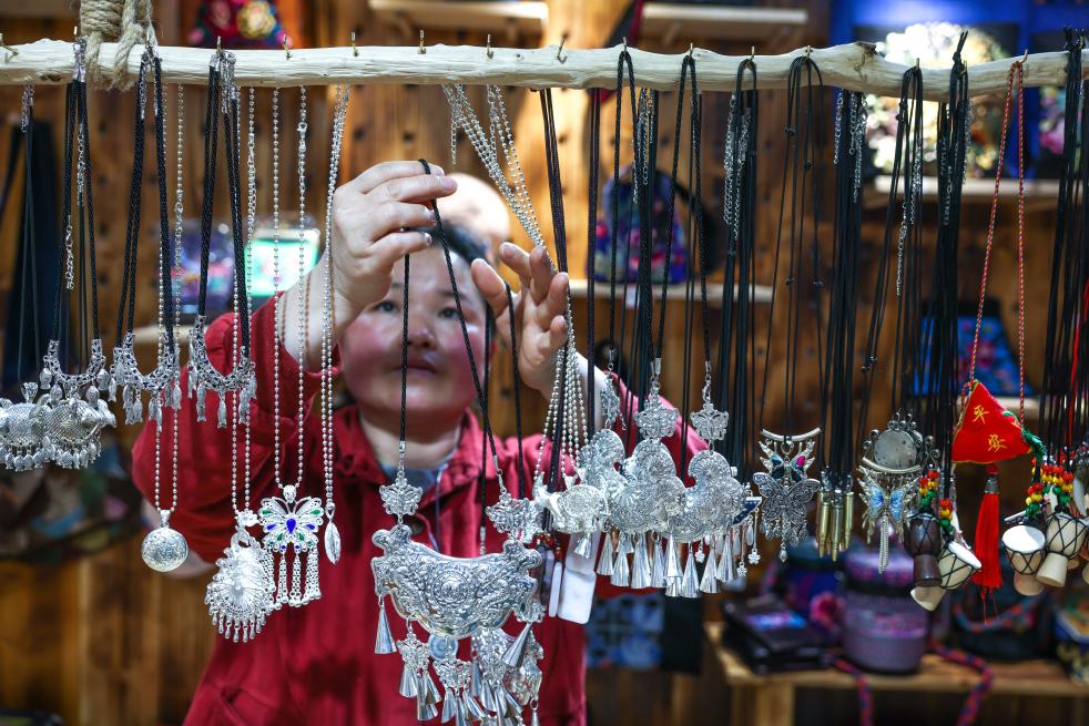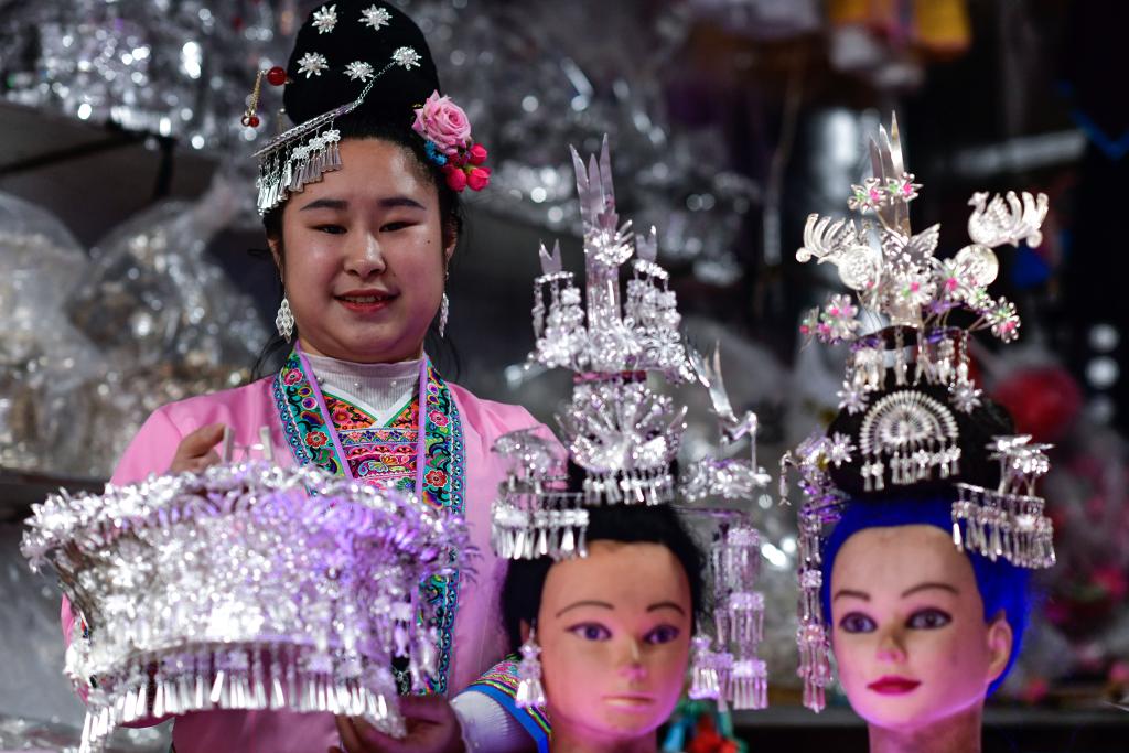 4月21日,贵州省黎平县水口镇的侗族姑娘杨爱鲜在整理自家银饰店里销售的银饰。