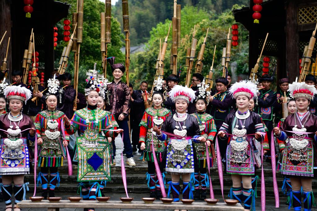 在贵州省黎平县肇兴侗寨,侗族姑娘们穿着银饰盛装迎宾(3月23日摄)。
